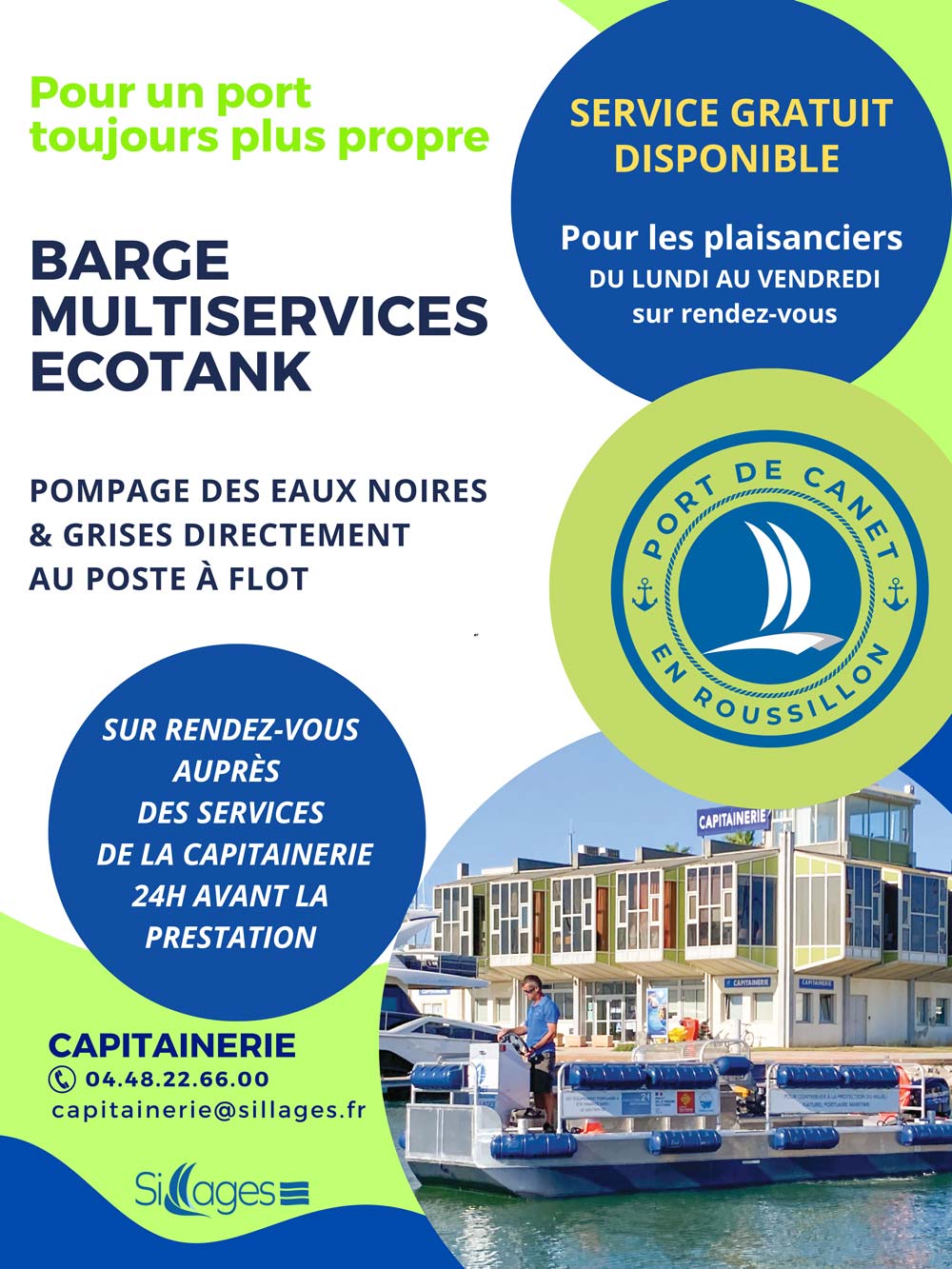 La SPL SILLAGES, délégataire de Service Public pour le Port de Canet-en-Roussillon, s’est dotée d’une barge Écotank environnementale multiservices, au service de tous les plaisanciers ayant un poste à flot sur le port.